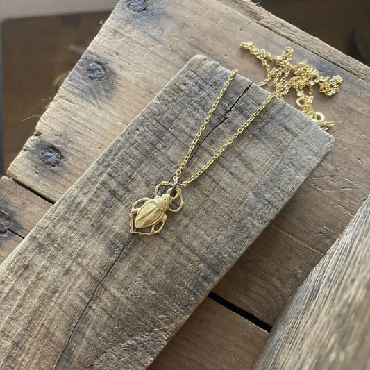 Tiny Brass Beetle Bug Charm Necklace