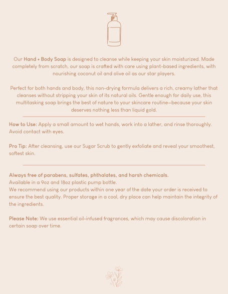 Our Hand + Body Soap is designed to cleanse while keeping your skin moisturized. Made completely from scratch, our soap is crafted with care using plant-based ingredients, with nourishing coconut oil and olive oil as our star players.