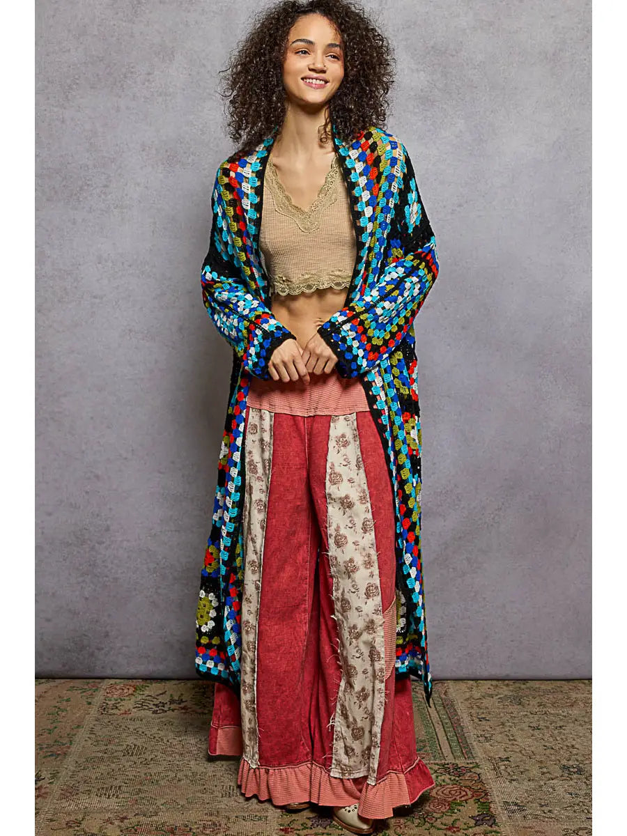Designed in long sleeve roomy fit cardigan in crochet with various colors and weave knit patterns.