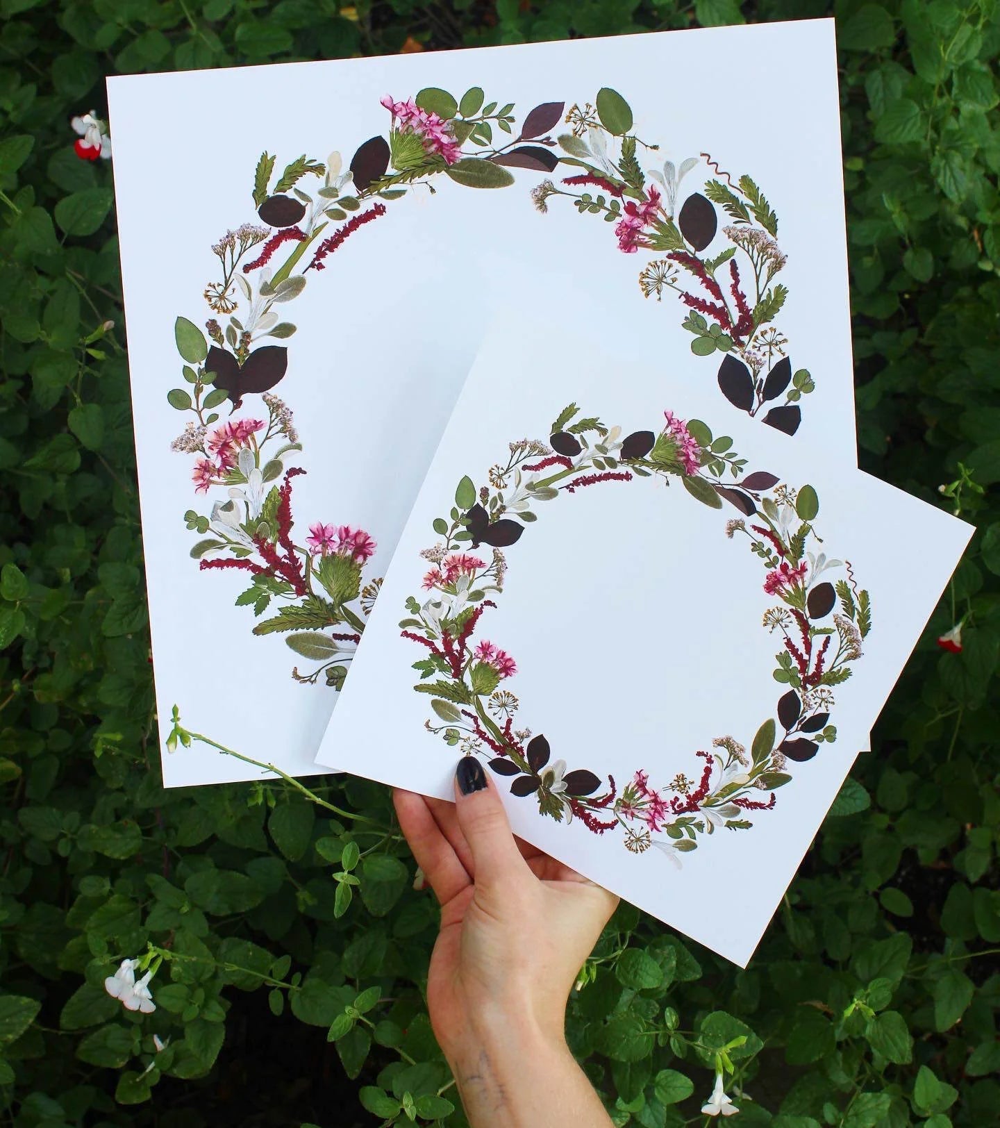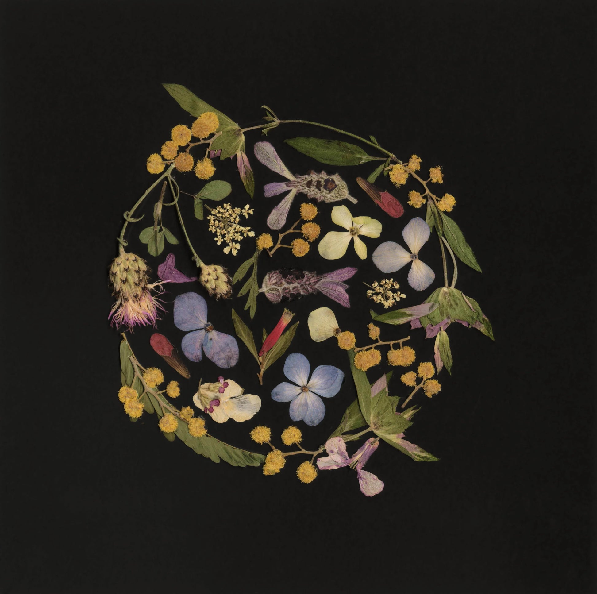 "High-quality prints of original pressed flower artwork featuring a collection of pressed flowers all grown in our garden or collected in North Carolina."