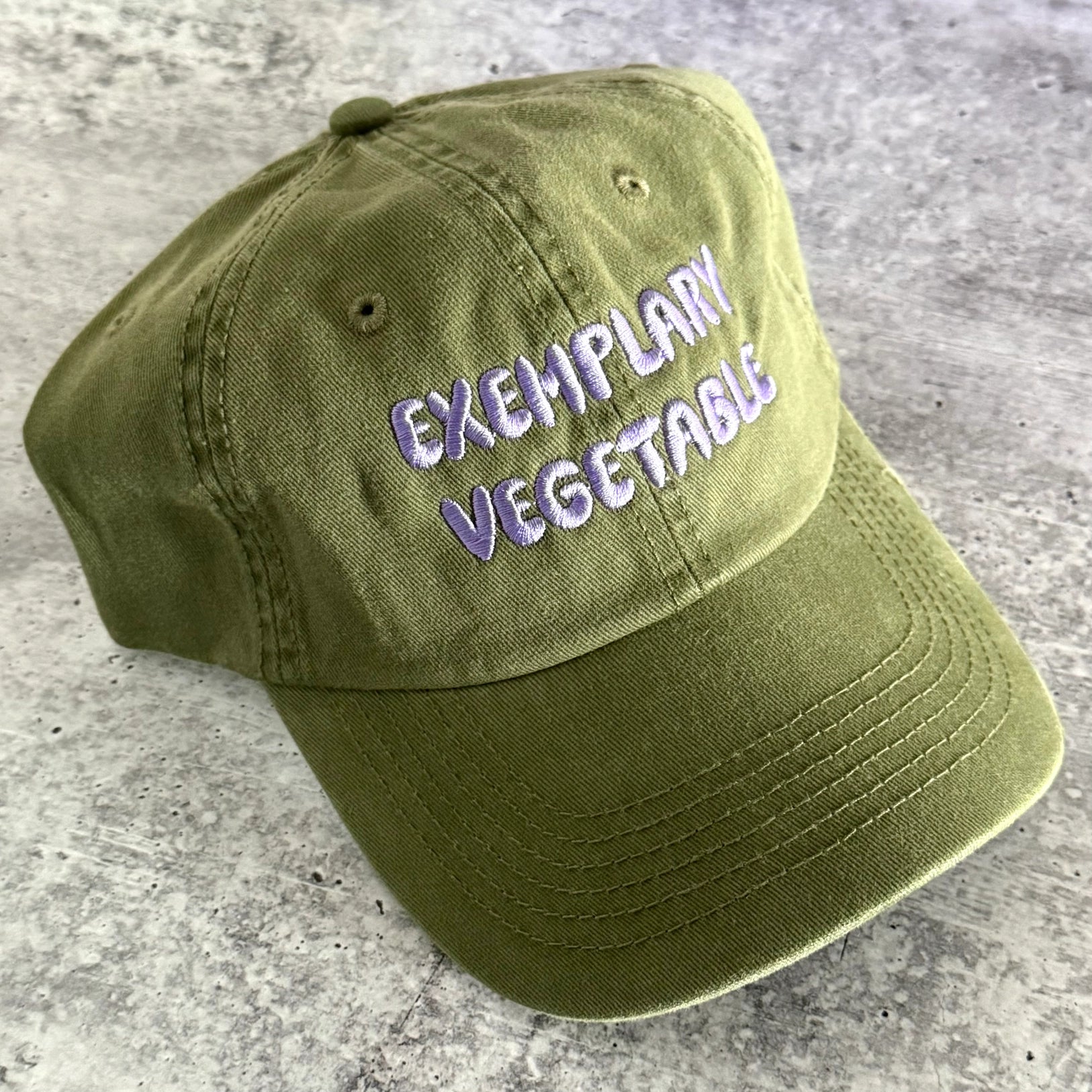 - one size fits most hat in pigment dyed green with lilac embroidery