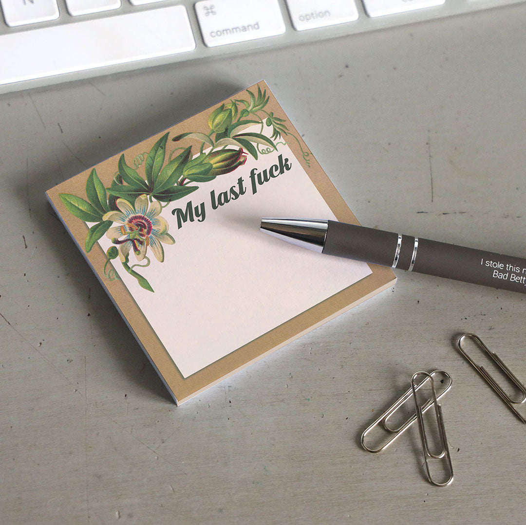 A funny vintage-inspired sticky notepad that says "My last fuck". It's a guaranteed way to lighten up a stressful workday. The perfect gift for coworkers.