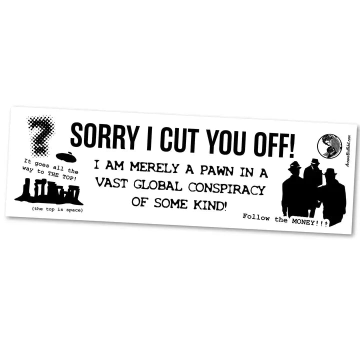 This 10" x 3" matte vinyl bumper sticker reads "SORRY I CUT YOU OFF! I AM MERELY A PAWN IN A VAST GLOBAL CONSPIRACY OF SOME KIND!" and isn't that true for all of us?