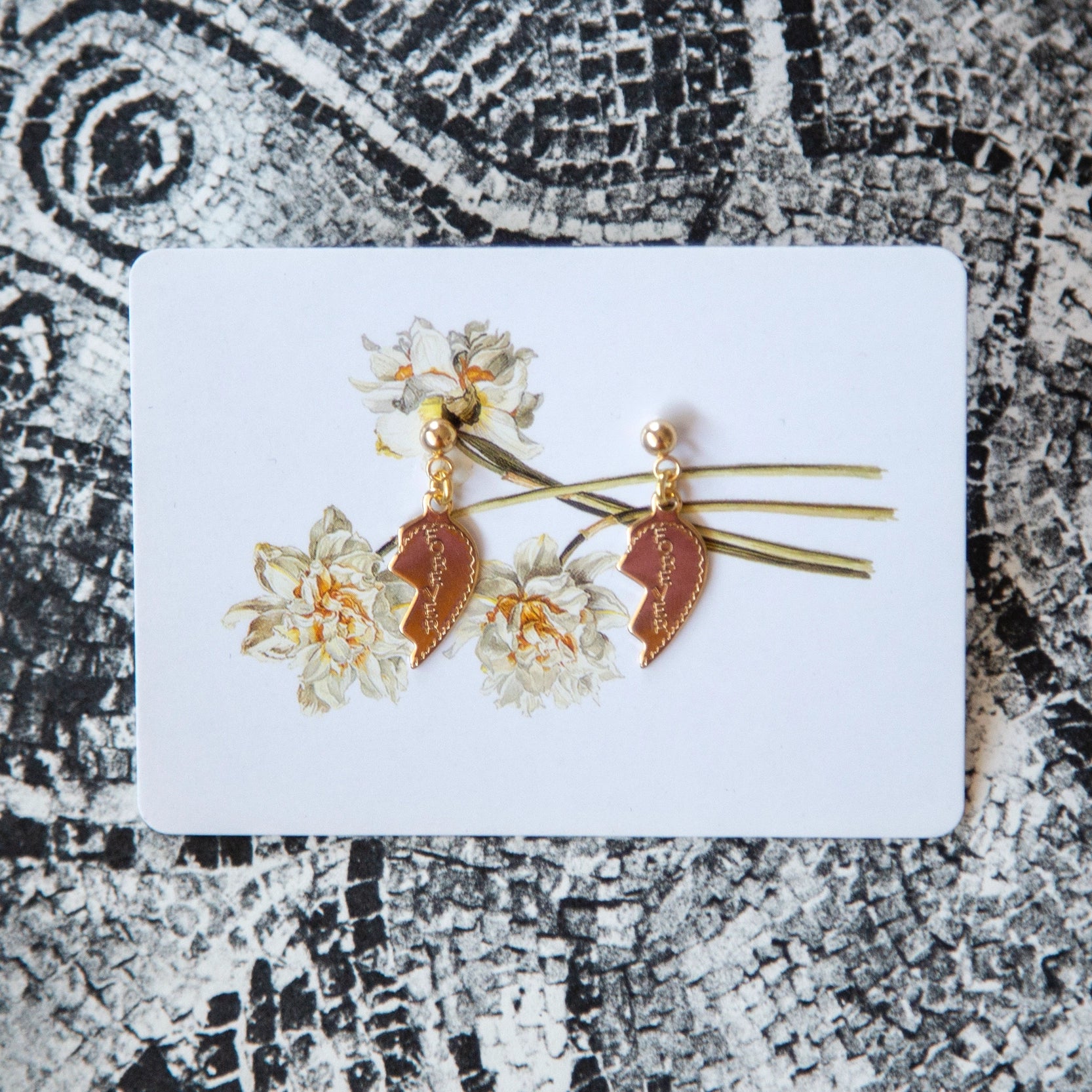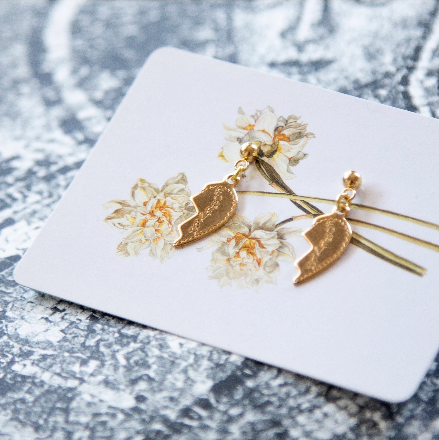 Deadstock vintage gold-plated broken heart charm with "forever" text etching on gold vermeil posts (2X industry standard gold-plating on hypoallergenic, 100% recycled sterling silver).