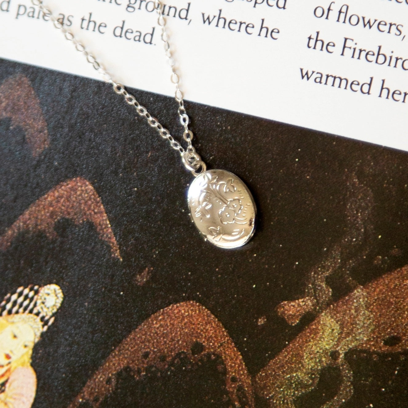 Deadstock vintage small oval locket with elegant floral embossing. Comes on a hypoallergenic, 100% recycled sterling silver cable chain. Locket opens!
