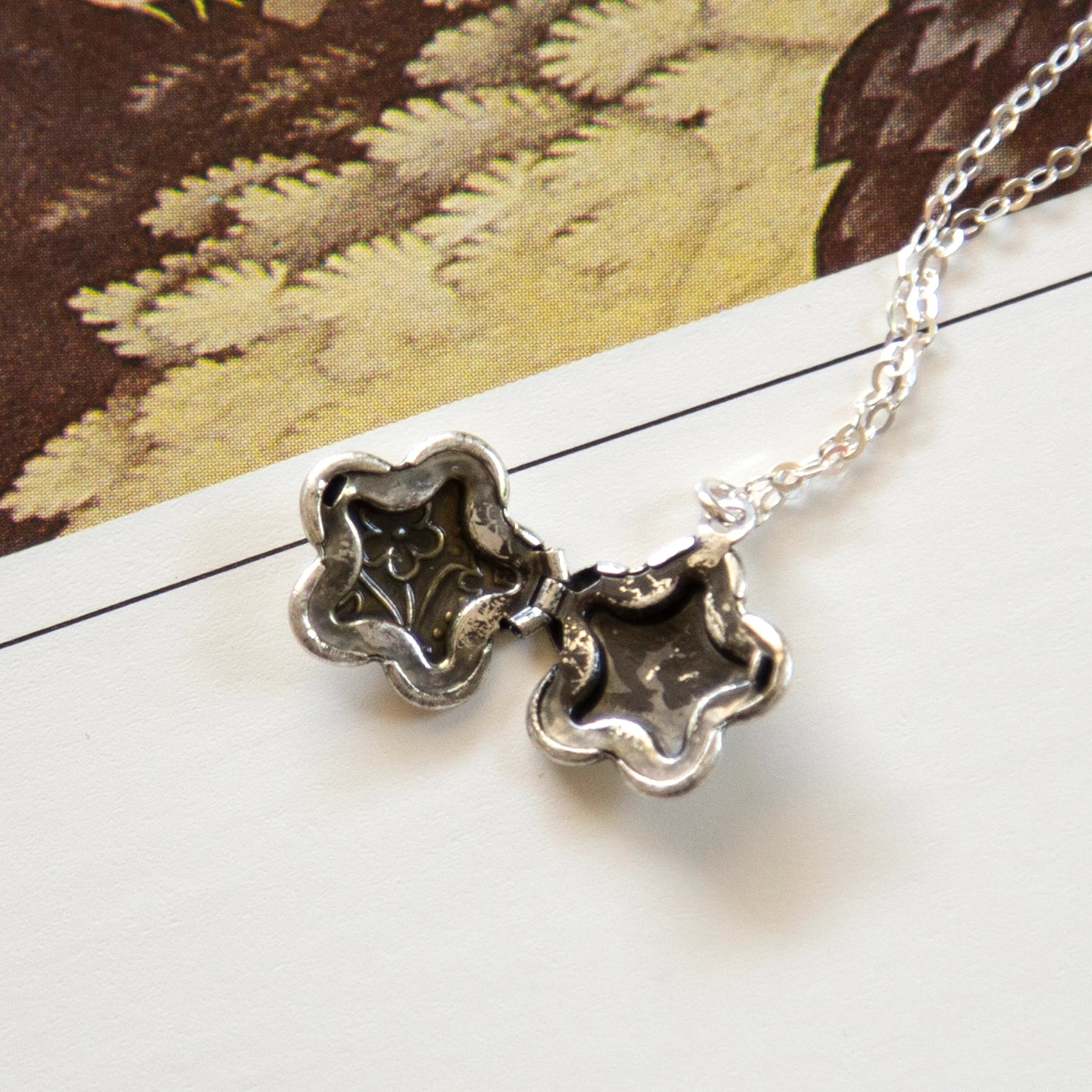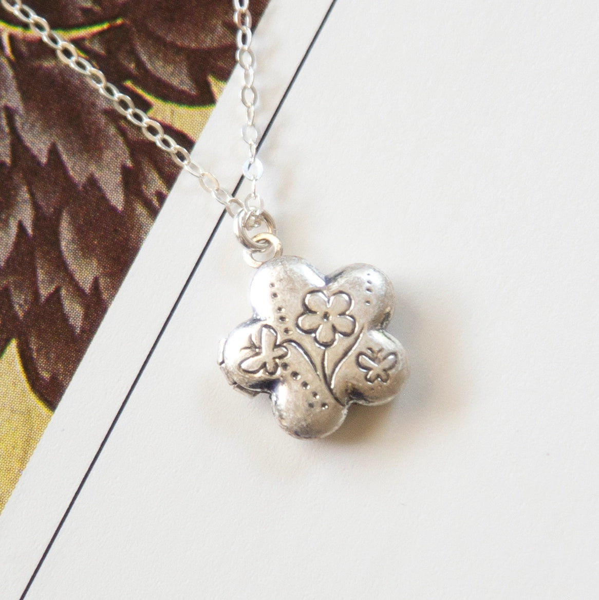 Deadstock vintage silver-plated flower locket with cute embossing of flowers and a butterfly. Comes on a hypoallergenic, 100% recycled sterling silver cable chain. Locket opens! Some dark tarnishing inside the locket from the plating process.