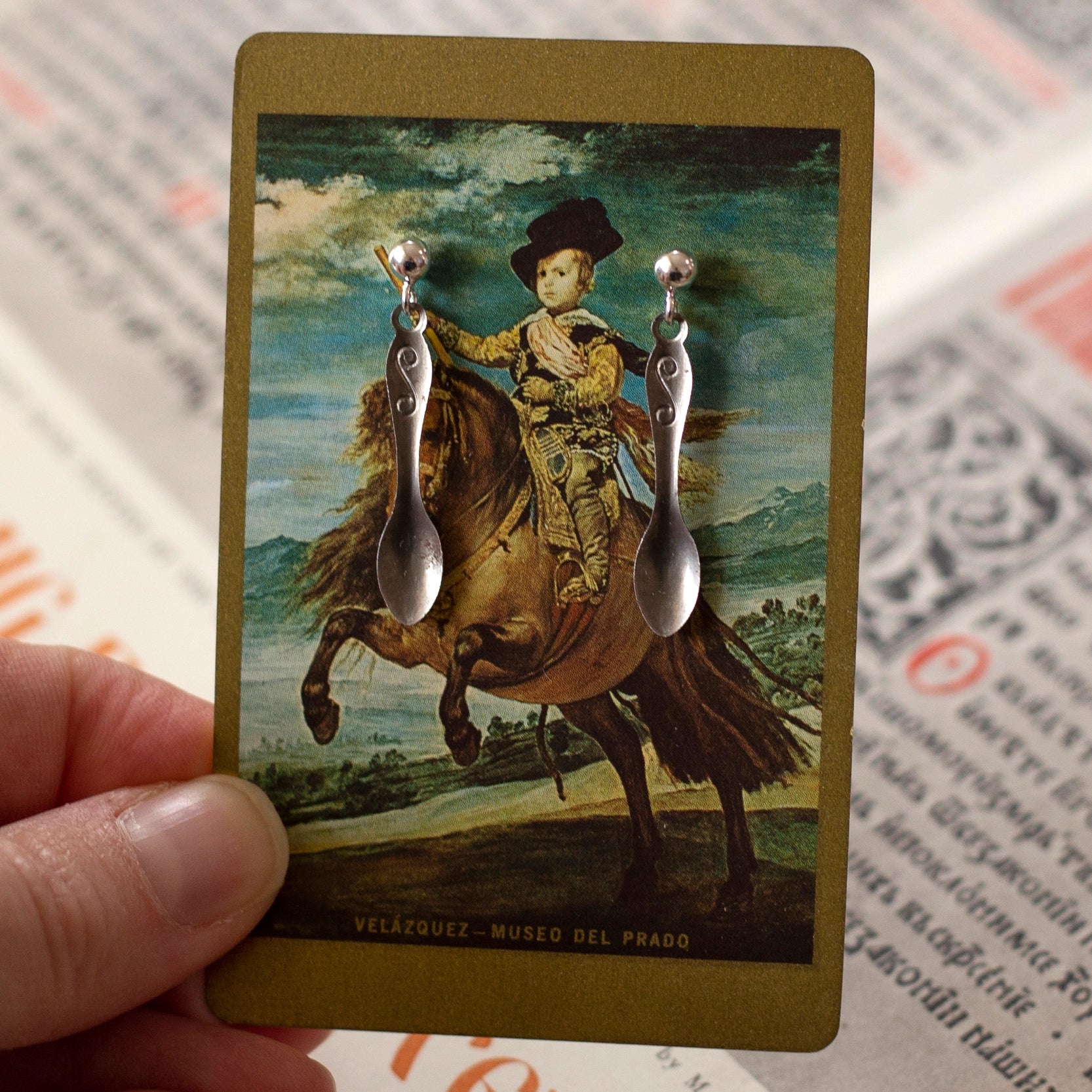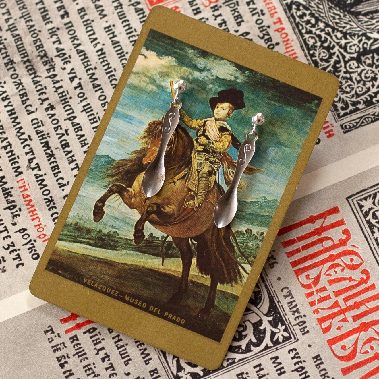 Vintage delicate silver steel spoon charms with an antique look, on sterling silver ear posts. These have some wear/rust/patina to them that add to their Victorian style. Pendants are from the 60s/70s.