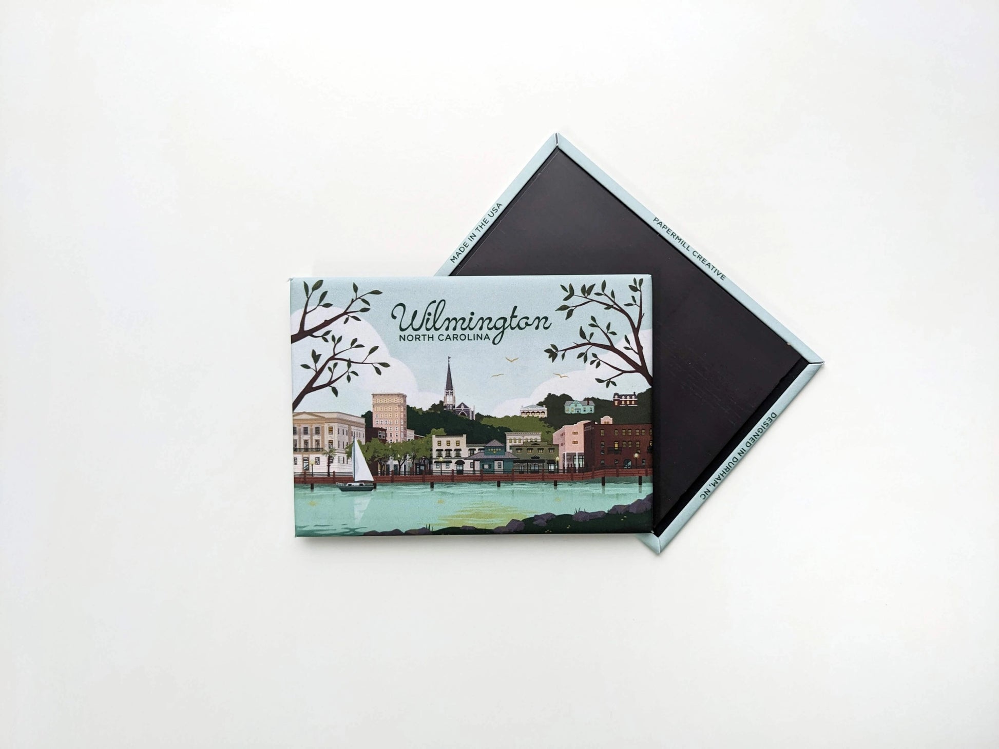 Commemorate your visit to Wilmington, North Carolina with this cute souvenir magnet! Featuring a colorful, retro-inspired view of Wilmington's Riverwalk along the historic Cape Fear River, this fridge magnet is the perfect addition to your souvenir magnet collection, or makes a great wedding favor or little housewarming gift for new homeowners.